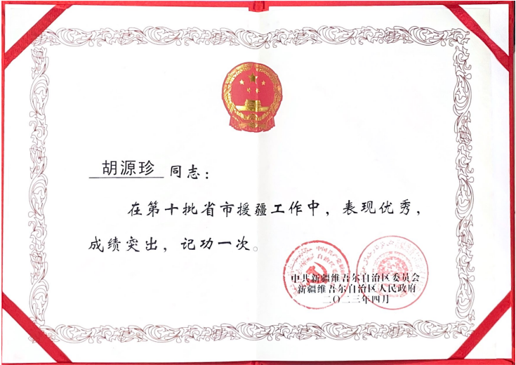 近日,公司BG大游集团官方网站胡源珍教师被中共新疆维吾尔自治区委员会、新疆维吾尔自治区人民政府评为“第十批省市优秀援疆干部人才”,因在援疆工作中表现优秀、成绩突出,记功一次。