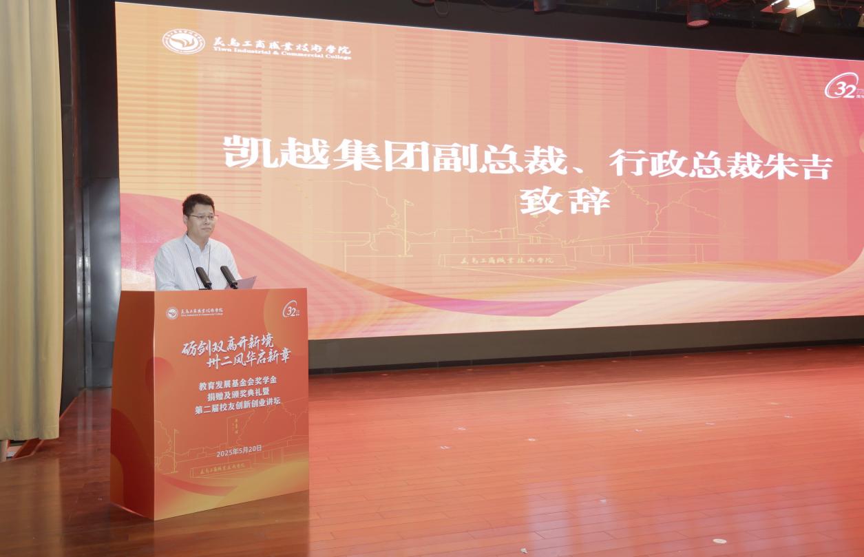 朱吉在致辞中表示,作为深耕外贸领域21年的国际化企业集团,凯越始终将人才培育视为企业发展基石。集团依托义乌这一全球商贸枢纽,与校方在创业基因与使命担当方面形成深度共鸣——公司“尚德崇文,创业立身”的校训与凯越推行的“事业合伙人制”理念高度契合,双方“植根地方、培育英才、服务全球”的共同愿景更构筑起校企合作的坚实基础。此次设立的“凯越奖学金”将作为战略合作新起点,通过构建“人才共育、资源共享、发展共赢”的联动机制,为贸易产业发展培养复合型高技能人才。