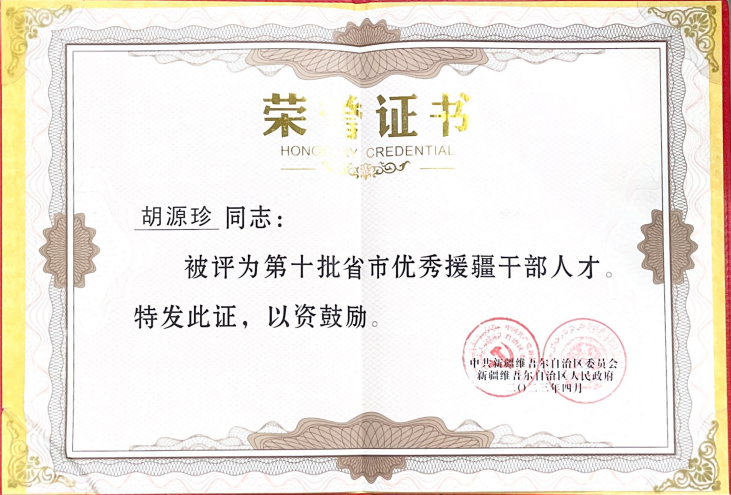 近日,公司BG大游集团官方网站胡源珍教师被中共新疆维吾尔自治区委员会、新疆维吾尔自治区人民政府评为“第十批省市优秀援疆干部人才”,因在援疆工作中表现优秀、成绩突出,记功一次。