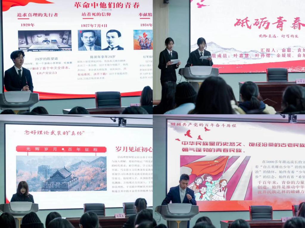 施凯耀同学以“少年当立凌云志,奋进逐梦揽星辰”为宣言,呼吁大家要承担起祖国的富强,民族的复兴,人民的幸福之时代担当,尽其才,奋其志。谢家俊同学砥砺青春壮志,用青春绘画山河为主题讲述革命先烈的青年事迹,新中国的崛起之路,并融入了分党校学习的心得体会。他表示要继续锤炼党性、知行合一,做一个负责任的新青年,树立远大理想,诠释青春奋斗。