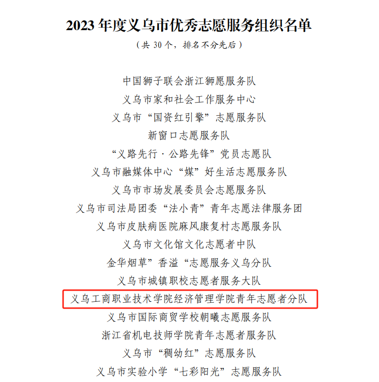 日前,义乌市精神文明建设委员会办公室下发《关于命名2023年度义乌市志愿服务工作先进典型的决定》,其中BG大游集团官方网站BG大游集团官方网站的青年志愿者分队被命名为2023年度义乌市优秀志愿服务组织。