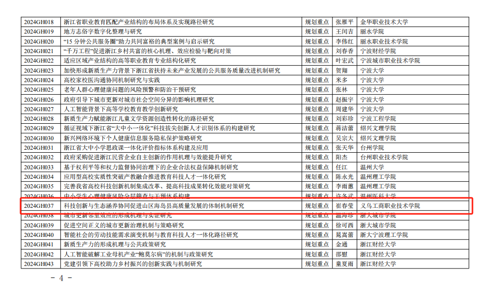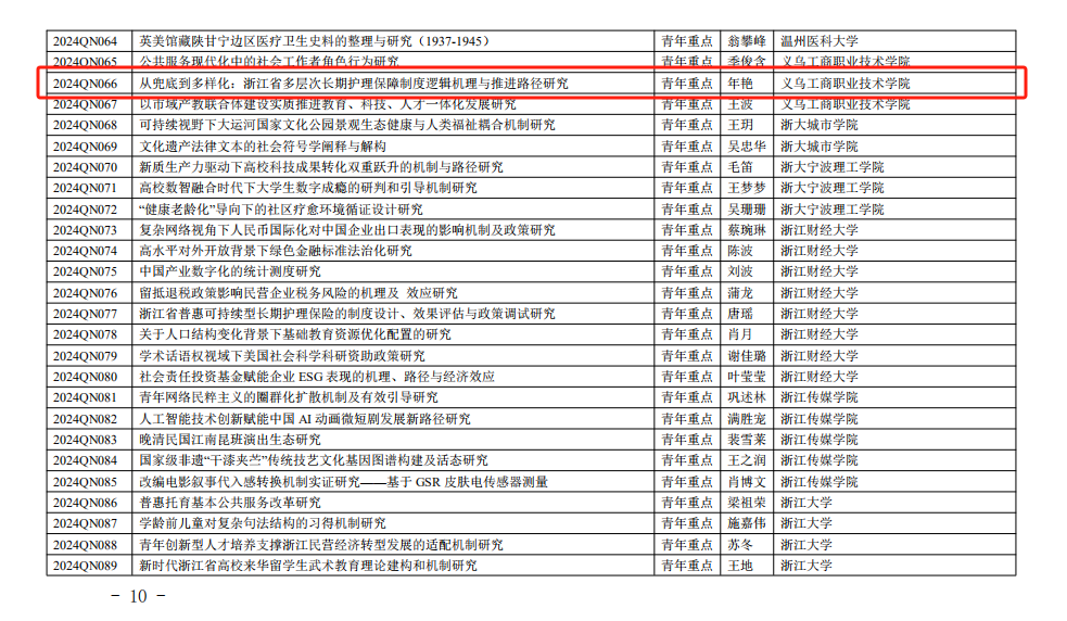 12月23日,浙江省教育厅公布了《浙江省教育厅办公室关于公布2023-2024年度浙江省高校重大人文社科攻关计划项目的通知》(浙教办函〔2024〕232号),公司共有2个项目成功入选,实现了该项目立项新突破。其中,崔春莹教授主持的课题获规划重点项目立项,年艳副教授主持的课题获青年重点项目立项。