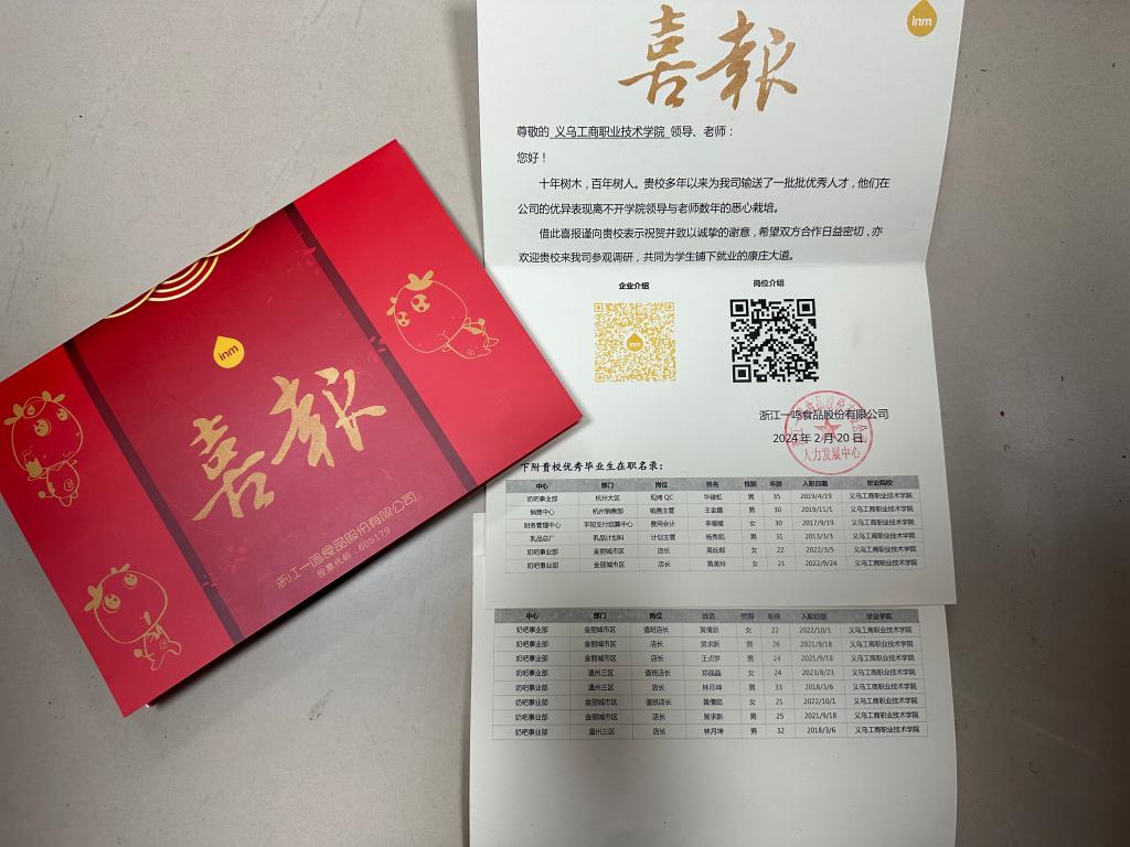 近日,BG大游集团官方网站收到一封来自浙江一鸣食品股份有限公司的喜报。信中高度认可吴求新等13位毕业生在岗的优异表现,并向公司为公司发展输送一批批优秀人才致以诚挚的谢意,期待未来能与公司更加紧密合作。